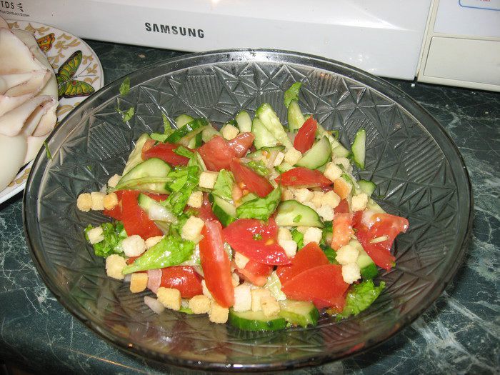 Нарезаем помидоры, огурцы, лук ссыпаем в блюдо, руколу режем сбрызгиваем лимонным соком, немного мнём добавляем к овощам, заправляем подсолнечным маслом, солью, перемешиваем, посыпаем сухариками. можно добавить зелень по вкусу.