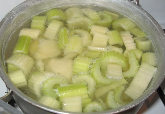 Ставим воду на огонь, пока закипает чистим картофель и нарезаем примерно одинаковыми кусочками с сельдереем, воду солим, загружаем овощи, варим ~ 25 минут.