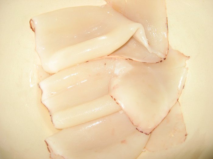 Ставим на огонь воду, когда закипит ошпарим размороженные кальмары, поменяем воду, пусть снова закипает, а мы пока почистим их. воду подсаливаем и варим 5 минут. пусть остывают, а пока сделаю салат.