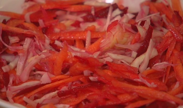 Свеклу и морковь почистить, натереть на крупной терке и добавить к капусте с луком.
