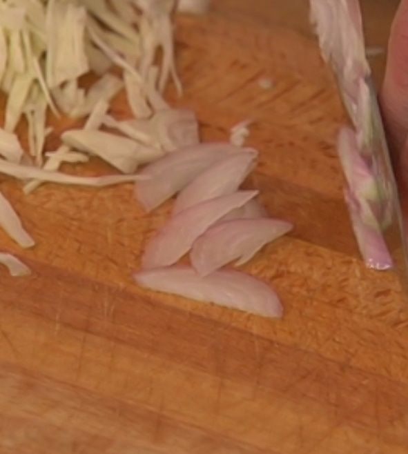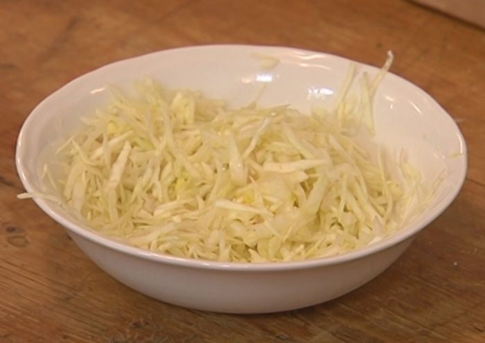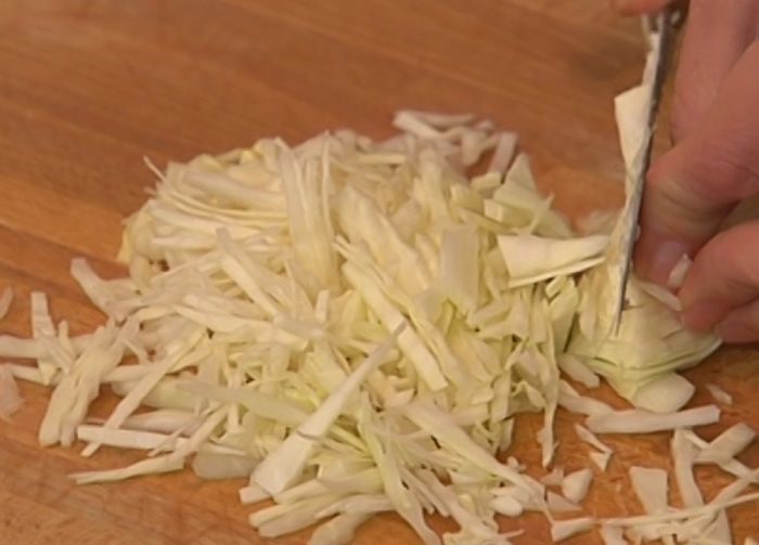 Шалот почистить, нарезать полукольцами и добавить к капусте.