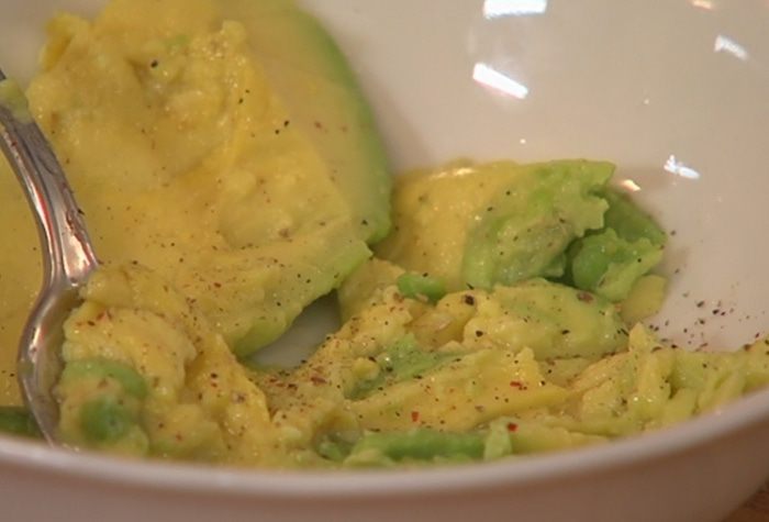 Мякоть авокадо вынуть ложкой, размять, сбрызнуть оставшимся лимонным соком, посолить, поперчить.