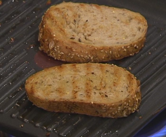 Разогреть в сковороде-гриль оливковое масло и обжарить хлеб с двух сторон.