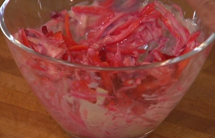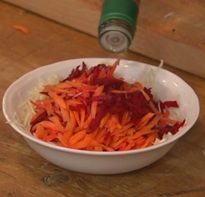 Посыпать овощи щепоткой соли и сахара, перетереть их руками, так чтобы капуста дала сок, и дать немного постоять.