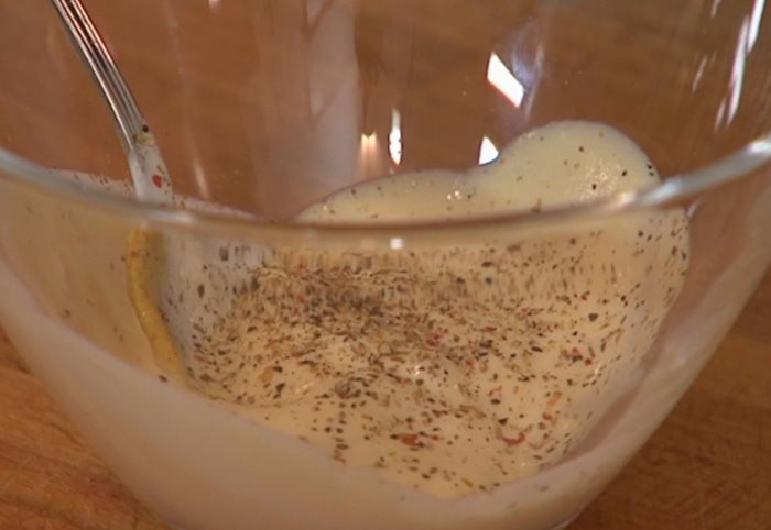 Приготовить заправку: соединить йогурт с горчицей, посолить, поперчить и перемешать, затем влить 1 ч. ложку лимонного сока и еще раз перемешать.