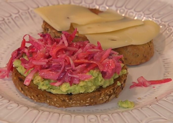 На кусок хлеба выложить размятый авокадо и заправленные овощи, сверху разложить кусочки сыра, накрыть вторым куском хлеба и сбрызнуть оливковым маслом Extra Virgin.