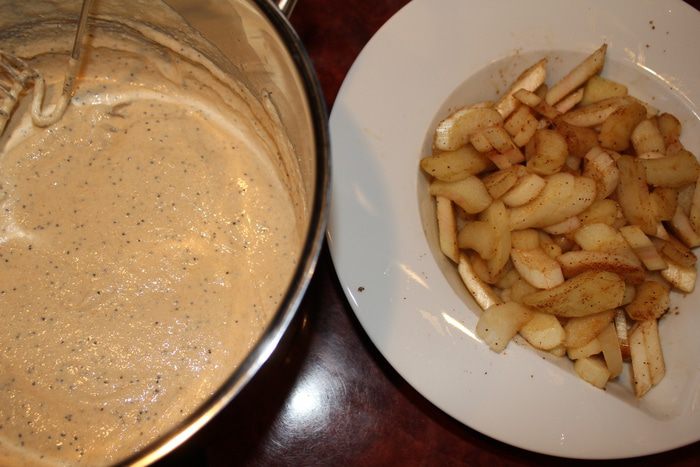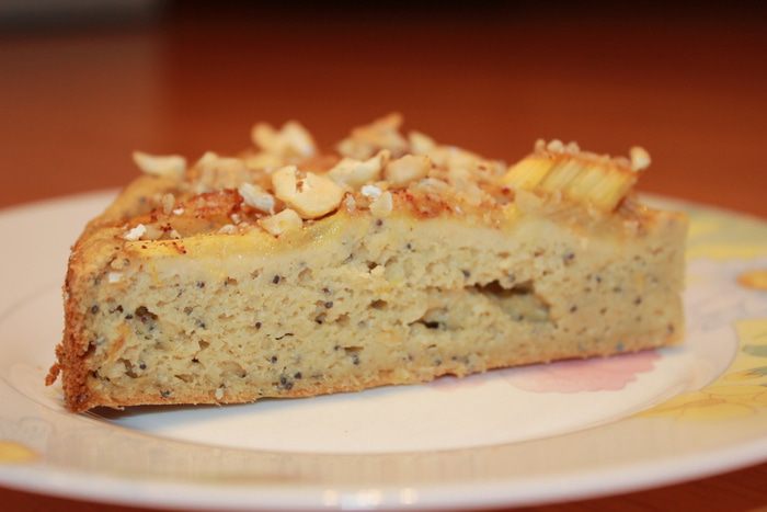 Ревень очищаем от верхних волокон, нарезаем дольками. Засыпаем 1 ст. л. сахара мусковадо и оставляем настаиваться. Яйца взбиваем до воздушной массы. Добавляем кефир и перемешиваем. Муку смешиваем с содой и добавляем в тесто, и все еще раз перемешиваем. Добавляем кленовый сироп и мак.
