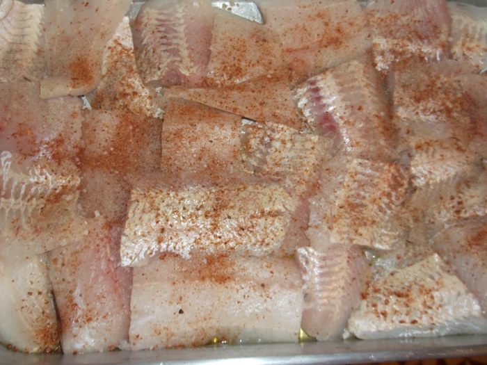 Нарезаем порционно рыбу, приправляем любыми любимыми приправами, выкладываем в форму, смазанную растительным или оливковым маслом, ставим в разогретую духовку (200 г) на 10 минут, что бы рыбка припустила сок и потомилась.