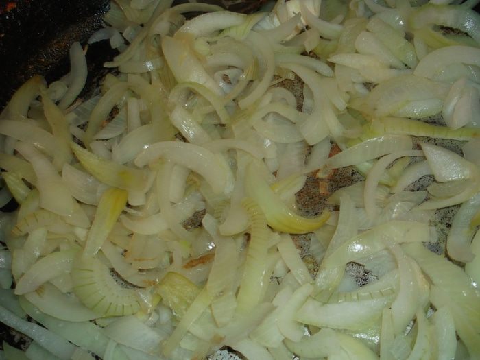 Нарезаем лук (давайте всё на свой вкус, если нравиться можете дать побольше лука, можете добавить моркови, всё по желанию) и томим на сухой сковородке, до мягкости.