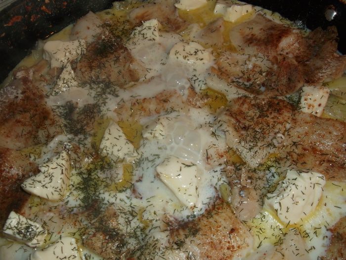 В кастрюлю с толстым дном или сюда же в сковороду даём сливочное масло, лук, выкладываем рыбку, добавляем молоко, так что бы рыбка была покрыта, и добавляем сырки.