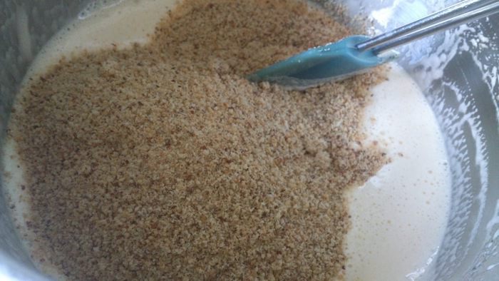 К яйцам добавить миндаль и перемешать.