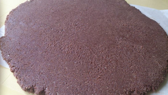 Раскатать тесто между двумя листами пергамента в пласт, толщиной 0,5 см.