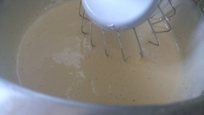 Яйца взбить с сахарной пудрой до пышной белой массы.