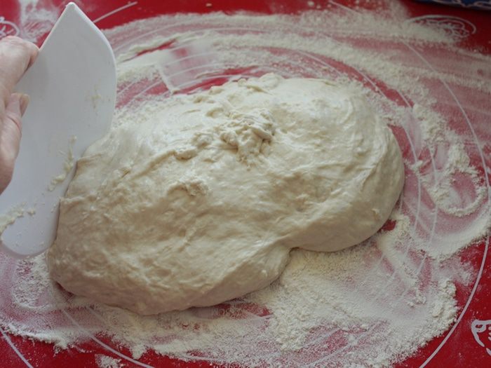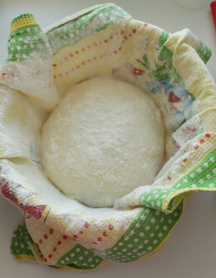 Обильно посыпать мукой чистое полотенце и выложить на него тесто. Посыпать мукой , покрыть сверху плёнкой и оставить ещё часа на 3.