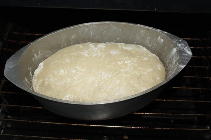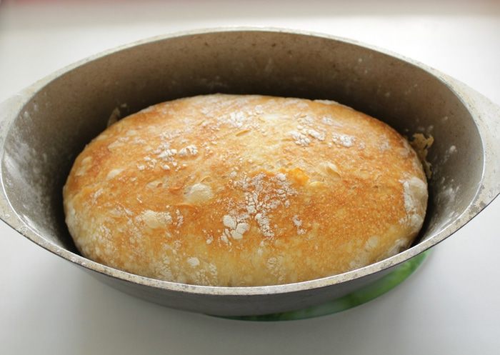 Аккуратно переложить тесто в чугунок (смазывать ничем не нужно), закрыть крышкой и выпекать 30-35 минут при 230*
