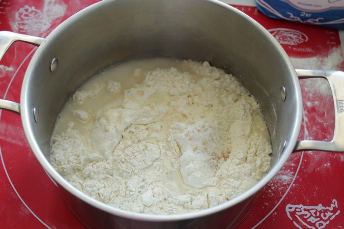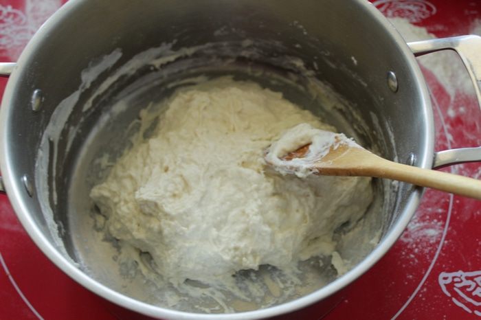 Просто перемешать деревянной лопаткой, пока мука не впитает воду, буквально 1 минуту.