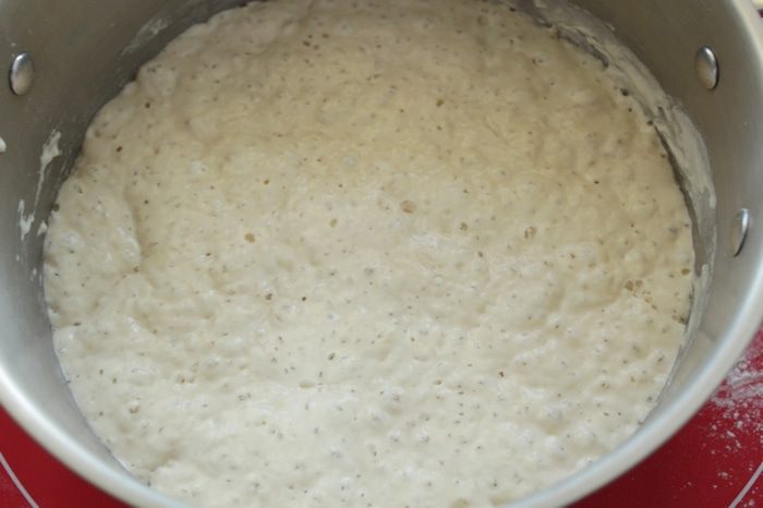 Тесто покрыть плёнкой и оставить на 18-24 часа. У меня стояло 15 часов. Тесто сильно пузырится.