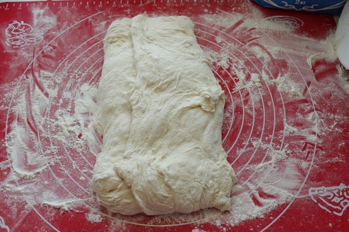 Растянуть тесто,затем сложить тесто в конверт: сперва вдвое.
