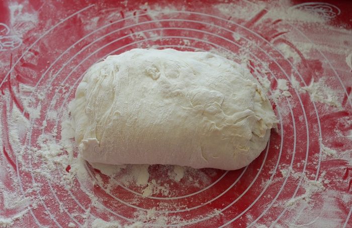 Обильно посыпать стол мукой, выложить тесто и присыпать мукой сверху так же обильно.