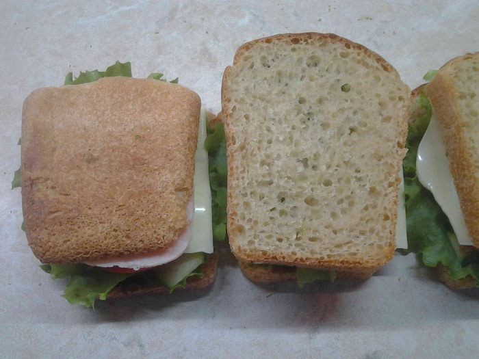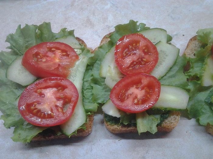 Оставшиеся два куска хлеба тоже смазать зеленым маслом с одной стороны и накрыть сандвич. Обматать сандвичи пищевой пленкой и положить под груз минут на 15. Развернуть сандвичи и разрезать по диагонали. Угощайтесь, приятного аппетита.
