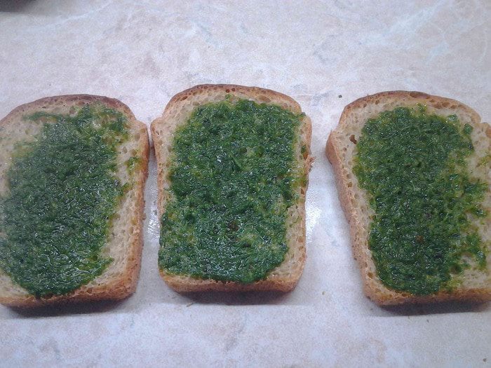Кусочки хлеба поджарить в тостере. два куска выложить и намазать с одной стороны зеленым маслом.
