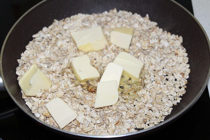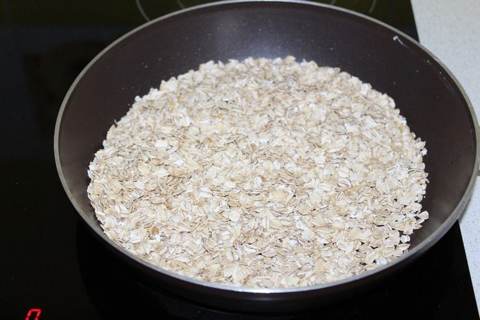 На сухой сковороде слегка обжарить овсяные хлопья ТМ «Националь».