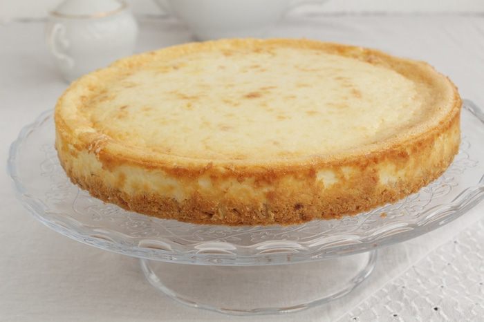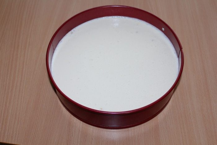 Сырную массу вылить в форму с печеньем. Выпекать в духовке на водяной бане 80 минут при 150°С. Дать постоять в духовке до полного остывания и на холоде не менее двух часов.