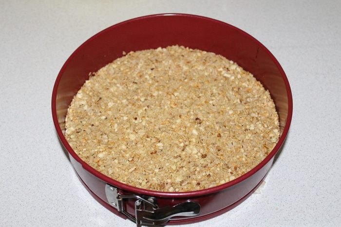 Выложить смесь в форму( 24 см), утрамбовать и убрать в холодильник на 1 час.