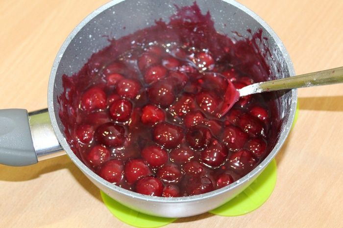 Крахмал развести небольшим количеством воды и тщательно размешать. Добавить к вишне, хорошо перемешать и проварить 3 минуты до загустения. Снять с огня, остудить до комнатной температуры.