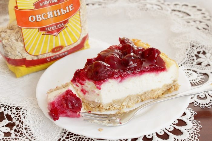 Нежный чизкейк с основой из овсяных хлопьев и печенья и густым ягодным соусом.