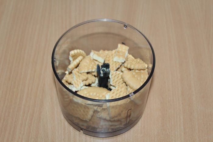 Печенье измельчить в крошку, добавить к хлопьям, перемешать.