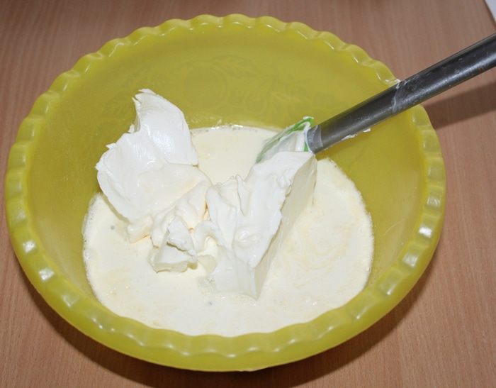 В миске растереть яйца с сахаром. Добавить творожный сыр, сливки, перемешать на низкой скорости.