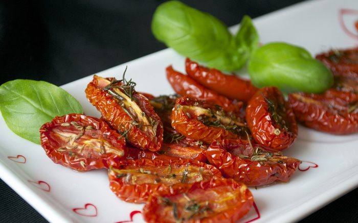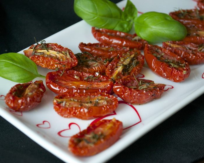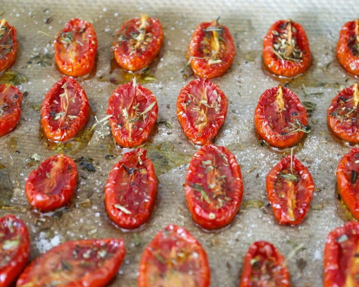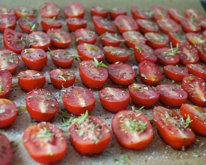 И, конечно, в этом рецепте все идет "на глаз"..., безо всяких пропорций. ))) Духовку разогреть до 100 С. Помидорки вымыть и разрезать пополам. Выложить на противень, застеленный пекарской бумагой. Посолить, поперчить, присыпать слегка сахаром (обязательно!), раскидать поверх помидорок листики тимьяна (можно присыпать немного сушеным орегано), сбрызнуть оливковым маслом, поставить в духовку.....и забыть о них на 3 часа! (кто-то добавляет еще измельченный чеснок, но у Луки их нет, и я тоже перестала добавлять последнее время. Вы можете попробовать оба варианта и после для себя решить, как Вам больше нравится).