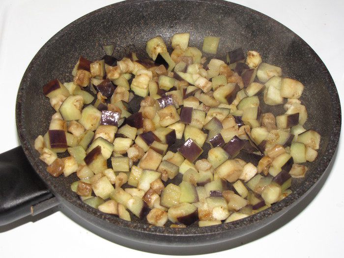 Пока тефтельки томятся, займемся гарниром. Баклажан порезать кубиком и обжарить на оливковом масле до готовности.