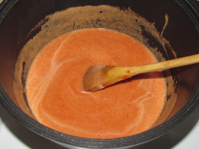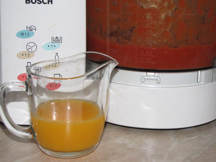 Томаты пюрировать с помощью блендера или кухонного комбайна. Из апельсина выжать сок.