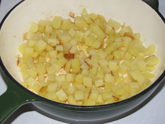 Картофель нарезать таким же кубиком и пожарить в отдельной сковороде. Затем соединить с баклажанами и перемешать.