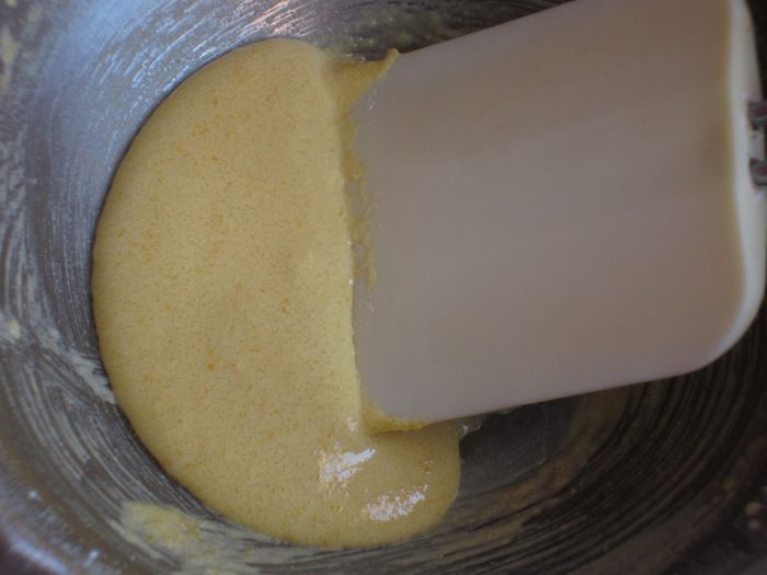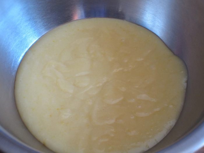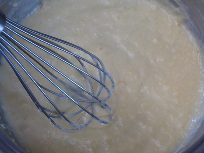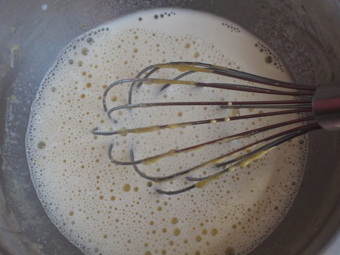 Тонкой струйкой влить тёплое молоко,энергично перемешивая венчиком до однородного состояния.