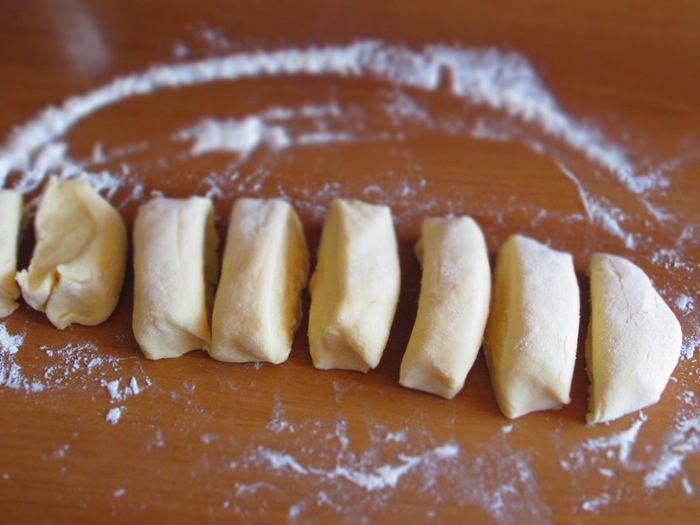 На присыпанной мукой рабочей поверхности сформировать колбаску и разделить её на 8 равных частей.