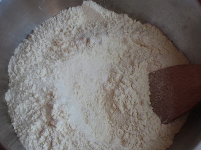 Тесто: Смешать муку с разрыхлителем,ванилином,сахаром и щепоткой соли.