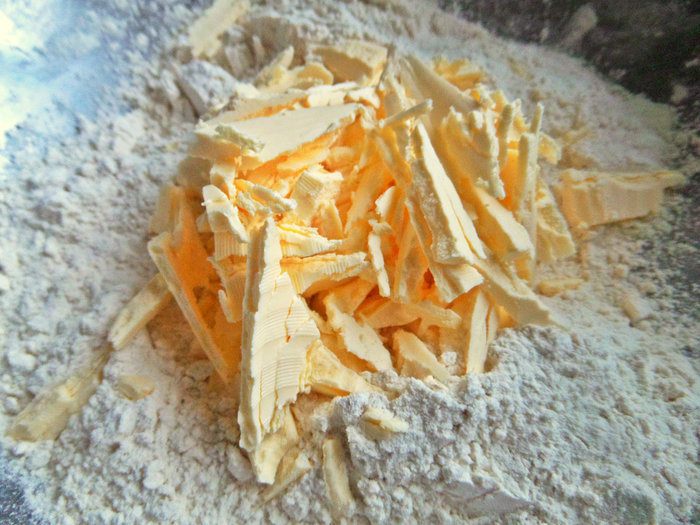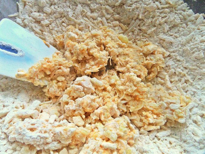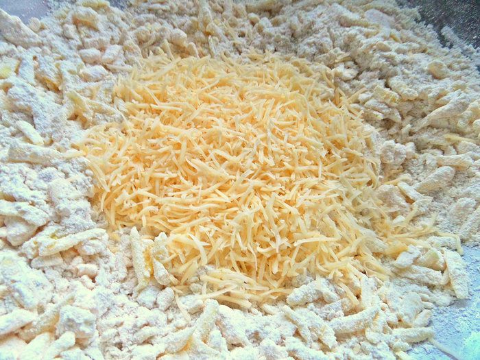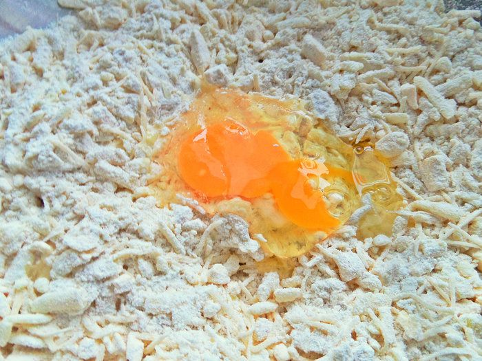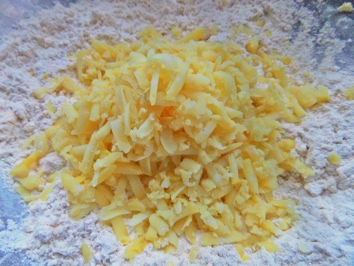 Натереть крупно в мучную крошку.