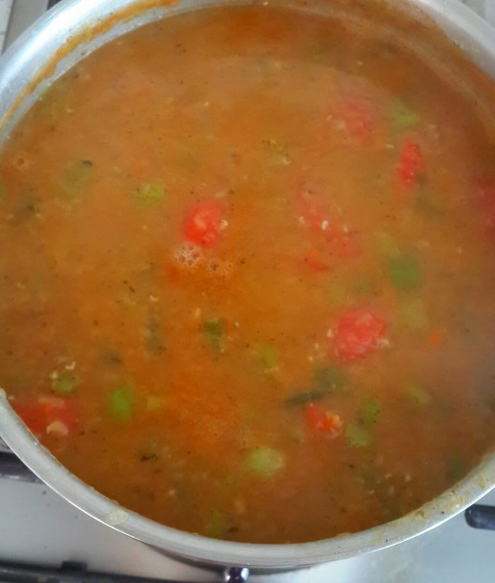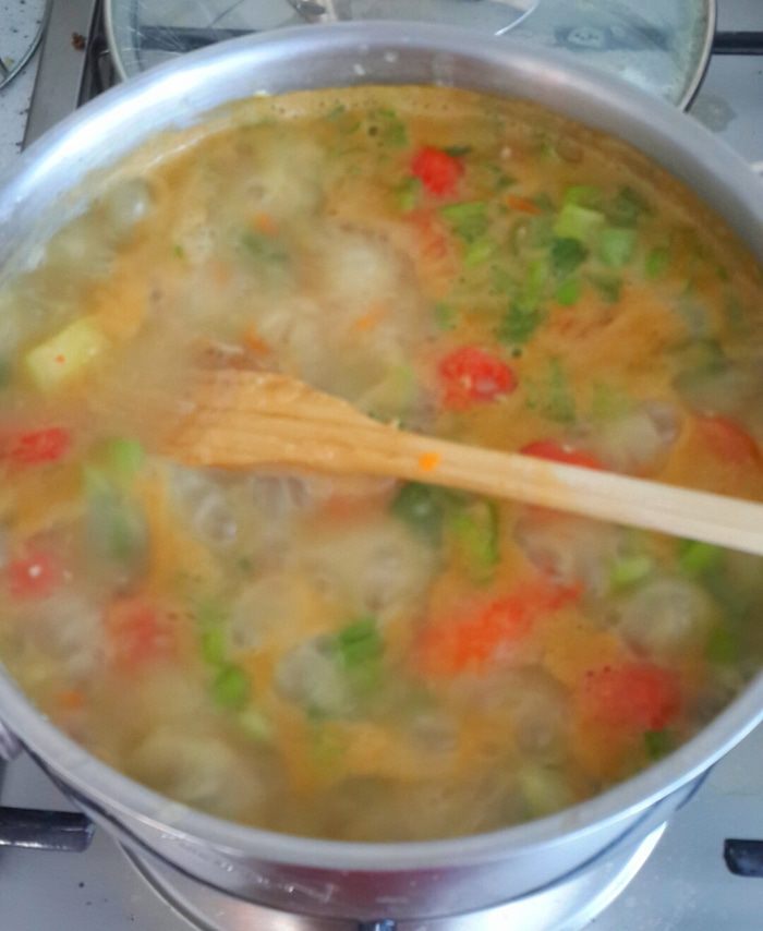 Помидорки ошпарить кипятком, снять шкурку, порезать и в суп. И вот суп вариться... солим, перчим. Я положила красный чили.... очень пекантно получилось. Да вот что... кипяток нужно доливать по мере выпаривания.