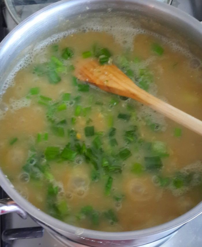 Закинули картофель в суп. Когда картофель стала мягкой закидываем лук. Я взяла зеленый... другого не было)))
