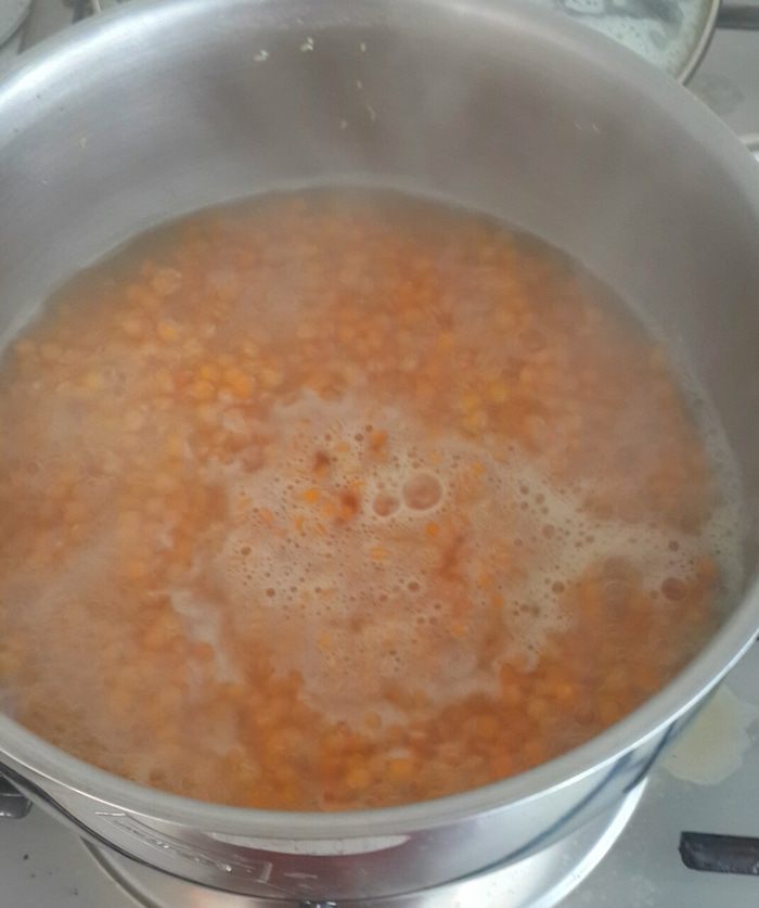 Ставим чайник с водой. Нам будет нужен кипяток. Чечевицу ставим на огонь. Доводим до кипения и тут же добавляем кипятка чтоб чечевица утонула.