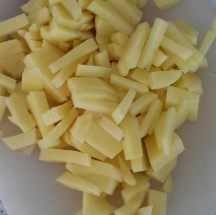 Тем временем чистим и режим мелко картофель.