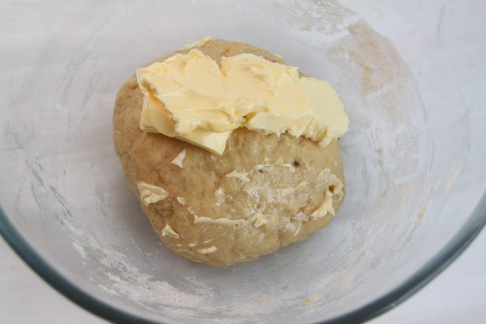 Через час добавить в тесто размягчённое сливочное масло. Вымесить.