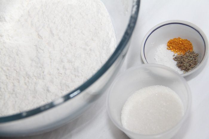Муку просеять. Добавить сахар, соль, анис, цедру.