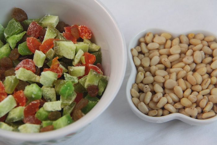 Отмерить цукаты, изюм и орехи.