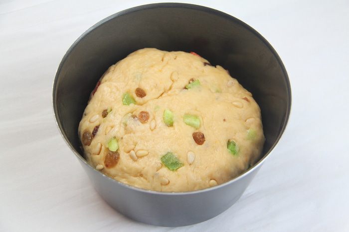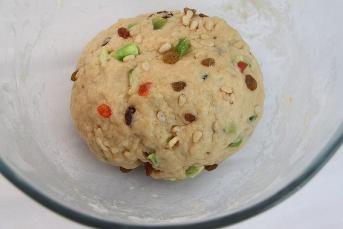 Добавить цукаты, изюм и орехи. Вымесить.