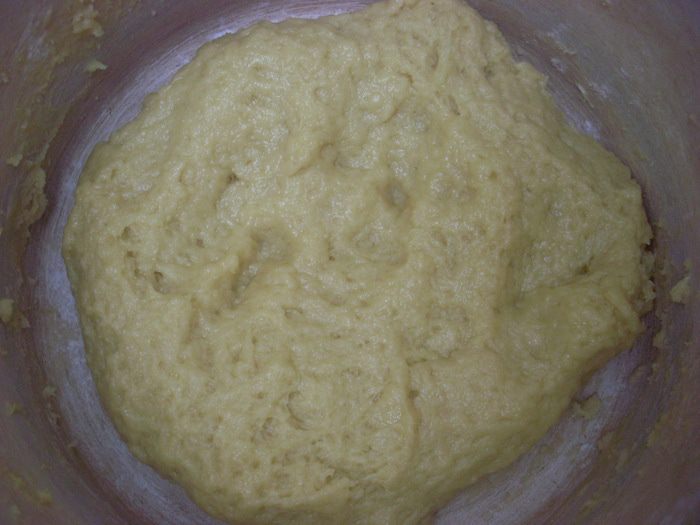 Так как дрожжи у меня были только сухие (шариками), то я проверяла их работоспособность, замочив в теплой воде. Для консистенции теста, так добавлять их было опасно - оно и так достаточно нежное получилось. поэтому я "загустила" дрожжи столовой ложкой сухого молока и добавила к тесту. Положила тесто на расстойку на 2 часа в теплое место (около батареи) - оно стало гладким и однородным, но не слишком подросло. Слила алкоголь из изюма. Добавила в тесто изюм и орехи.