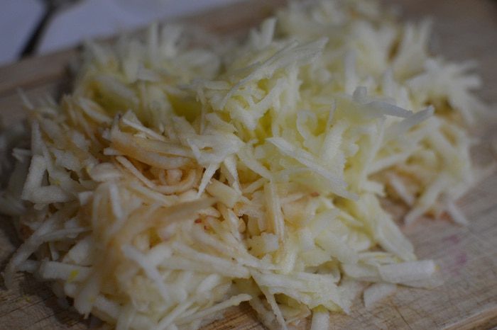 Яблоки помыть, почистить от семян и кожуры, натереть на крупной терке.